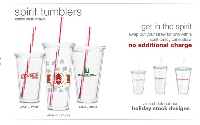 Order our ever-popular Spirit Tumblers with Candy Cane Colored Straws for your holiday promotion! For the fullest impact, take advantage of our beautiful holiday stock designs – choose from snowflakes, reindeer, ornaments and more then just pop in your logo!
