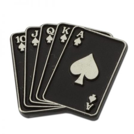 Our Playing Card Related Items are popular with casinos, poker tournaments, formal parties, and card rooms. Many of our products feature the iconic royal flush displaying the ten through ace of the same suit. These Royal Flush Lapel Pins show the 10, jack, queen, king and ace of spades cards fanned out together on a black enamel background. Another option are our Royal Flush Key Chains that can be laser engraved or imprinted on the back. Each keytag includes a gift box and a satin metal key ring to attach those same suited cards to any set of keys.