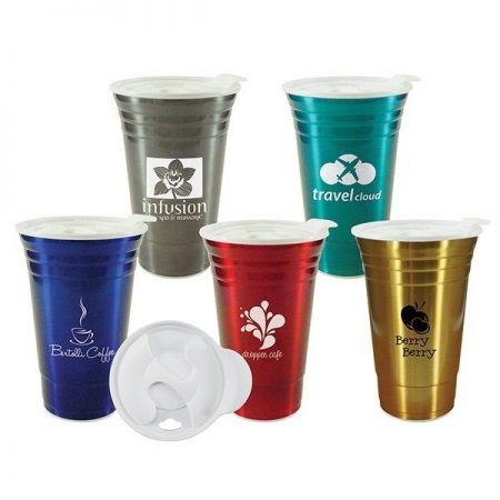 Our fun looking Party Cup Tumbler Drinkware keep cold beverages icy cold and hot liquids piping hot. Each vintage style uno cup is double wall insulated and features a spill resistant lid. Choose from five bold metallic color options to brightly show of your logo or custom design. These classic cups look similar to red solo cups and are perfect for beach bashes, summer weddings, state fairs, county fairs, and homecoming events.