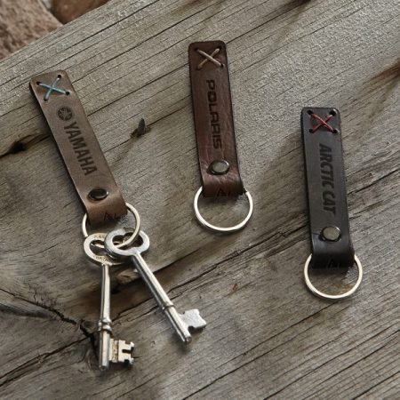 These Rugged Leather Keychains are Made in America and feature your deboss stamped company logo on the face. Choose from these distressed authentic hide colors: tan, gray, black, brown, and mahogany. Many waxed stitching colors options are available to match your brand color scheme also. Stitching colors are black, white, natural, gray, blue, turquoise, green, yellow, orange, rusty orange, maroon, and pink. With high-quality rivets and premium key rings, our leather key tabs are perfect for ATV dealerships, bicycle stores, adventure outfitters, utility vehicle shops, and other businesses.