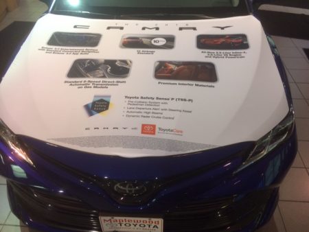 We offer custom sewn spandex fabric wraps for use on car, truck and SUVs. These custom automotive displays are great for dealer showrooms. These fabric panels are custom sewn and have elastic edges to fit the size vechicle you are looking to use them on and can be printed in full color with logos, graphics and text. All jobs are quoted to order, but here is pricing for the example shown as of 2017: