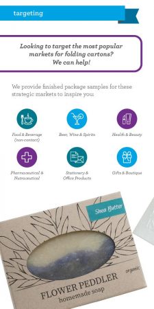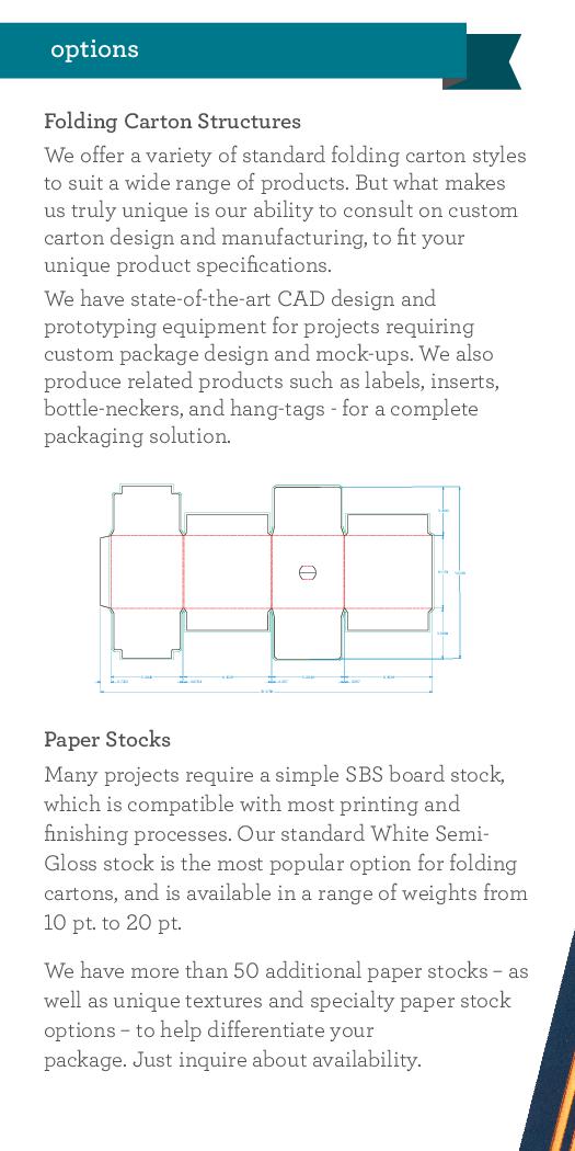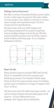 Whether you are looking for custom pillow packs, roll tuck boxes, straight tuck boxes, or other folded cartons we can offer completely custom designed packaging and cartons made of 10 and 20 pt SBS paperboard. Our custom design services include figuring out the size and shape of packaging needed for your product and application as well as working through our custom printing and decorating options for your personalized boxes.
